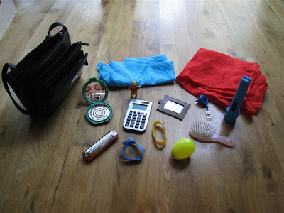 In addition to the activity bags, I also filled an old pocketbook with fun items for O to explore during our trip. The pocketbook has lots of zippered pockets, and I put at least one item in each pockets. The items are: 2 playsilks, a compact with a mirror, a tiny Winnie the Pooh, a calculator, another small mirror, a waistband key thing (Elliott has his work key on one of these, and O loves to play with it when he gets home from work each day), a small flashlight, a harmonica, 2 velcro bracelelts, silly putty, and a small brush. O is really proud of her "bockbeckbook!" She puts the strap on her shoulder and walks arounds saying "ike mama," which is pretty funny since I can't stand to carry a pocketbook!