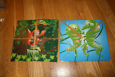 Puzzle activity bag. These puzzles came from a cutting book for children. I laminated the pictures then cut them out to make puzzles.