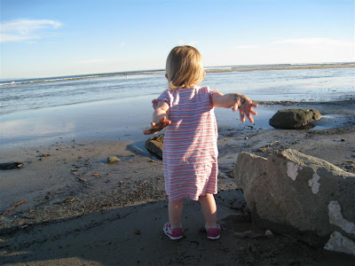 Writing "name" in the sand with Dada. O announced that she was writing "mama, dada, O, Grace, Socks," and she was very proud. She kept saying "write name."