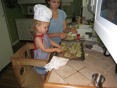 making homemade apple chips, I knew we had to try it. O loves apples, and this is a perfect way to enjoy them. Luckily, Elliott was able to find organic apples at the grocery store near his office. I didn't have the nutmeg or cloves (and I didn't think to ask him to get them from the store), so I mixed cinnamon and sugar and put it in the empty cinnamon container for O to sprinkle on the apples. She loved it!