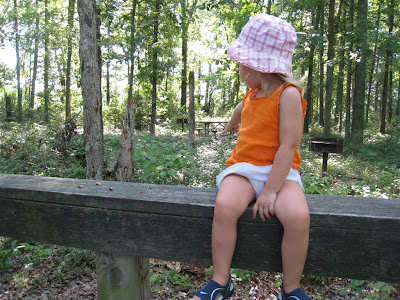 My balancing girl was scared to cross the stream on this log at first, but then she said "O's not scared anymore!" and she wanted to go all the way across (which she couldn't do since it was a rotten log, so Elliott couldn't cross with her to hold her hands). Btw, O is VERY proud of her oversized t-shirt that Elliott brought her from his recent ski trip. She ran up to M when she arrived and said "See my new dress!"