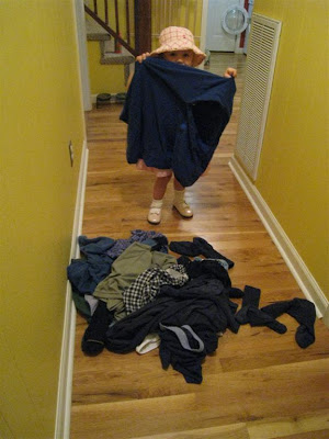 One of O's favorite things to do is to "elp mama" load the washing machine. I sort the clothes from the hamper and put them in a pile in the hallway (outside the linen closet where the hamper is kept), and she takes them piece by piece to the washing machine. This keeps her busy for a LONG time (long enough for me to fold and put away a load of clothes), and she is very proud of herself. She kept sniffing the clothes while saying "dada's shirt dirty." Occasionally, she'd say "stinks" although none of the clothes actually stank :)