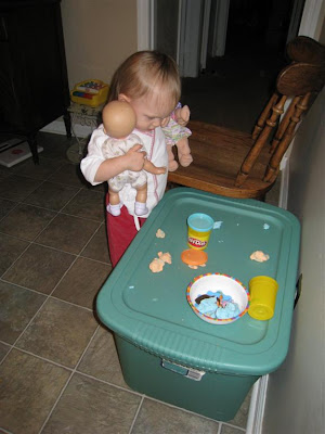 O loves all of the baby dolls at G & G's house, and she LOVES playdoh You can see that she's trying to decide if its worth putting the dolls down in order to play with the playdoh. Its a tough decision!.JPG)