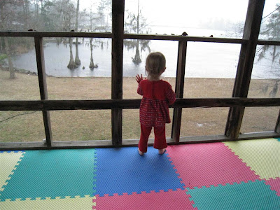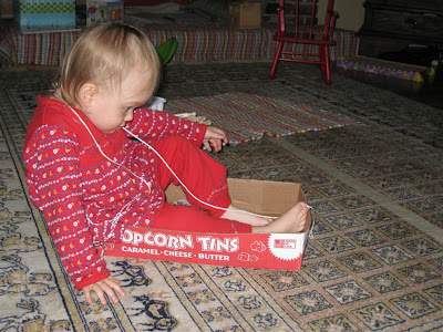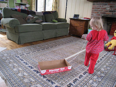 The box lid wagon really is a hit! In this picture O is trying to figure out how to make it go while she's in it. Notice how she has the string around her neck. Ahhhhhhhhhh. She loves to wear necklaces and puts anything like a necklace around her neck. I have to watch her like a hawk!