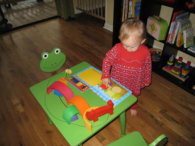 O has gotten so much better at independent play lately. Yesterday she played with her rainbow stacker, cat puzzle, and shape book.