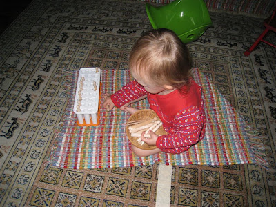I found these wooden flowers at my mom's house and thought this would be a fun, fine motor activity for O to do. She really had to concentrate, and it was not easy for her to get the flowers into the holes. She stopped about halfway through. I should have only given her a few flowers at a time. I left the work for her to finish later, and she came back and did a few more after about 15 minutes. For the more experienced Montessori mamas out there... what do you do when your child doesn't finish her work? Did I do the right thing by leaving it for her to finish later? Should I have had her clean it up since she wanted to do something else? What is the Montessori way of handling this situation? Thanks for any input!Independent Play