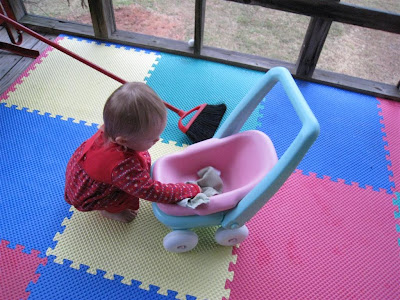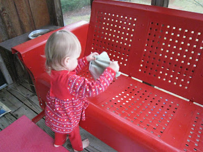 Its been a rainy day, but O and I have enjoyed it. After watching the rain for a while she decided to sweep the water off the glider. I gave her a cloth and showed her how to dry it, and that worked much better. She also enjoyed drying her baby stroller.