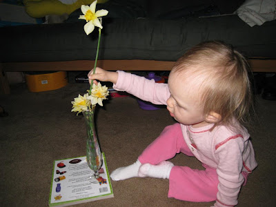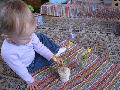 The idea for this activity came from Montessori Mama's wonderful blog. I'd never thought about having O arrange flowers since she is so young, but I decided to give it a try. I bought some pretty silk daffodils and cut them into individual flowers. I had them ready to use, but then I noticed that my mom had a vase of real daffodils on her kitchen counter. Its always better to use the real thing, so I removed the daffodils from the vase and took everything into the den. O was VERY excited when I told her that she could put the flowers into the vase. She loves flowers, so this was the perfect activity for her. She had a little trouble since the vase was so tall. I'm hoping I can find some small bottles for her to put her fake flowers in now that we are at home. Thanks, Jennifer, for another great idea!