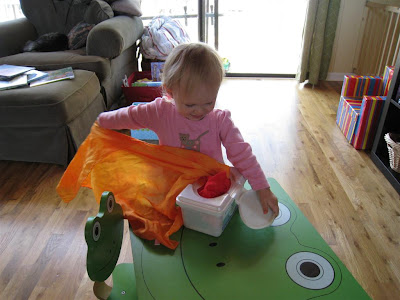 We haven't played with O's playsilks in a while, so I brought them back out today. I put them all in an old baby wipes container. She loved pulling them out one by one. She also had fun wearing the silks as capes and putting them on my head.