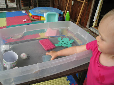 O and I played with water on the screened porch today, and we tested different objects to see if they floated or sunk. O understood the concept of floating, but I'm not sure if she knew exactly what sinking meant. I didn't have enough water in the container, so the objects that sunk still broke the surface of the water. Oh, well. We had fun and that was our main objective. Shortly after I took this picture, O decided that she couldn't "each" well enough, so I put the container on the floor. Shortly after that she stripped and was taking an impromptu bath in the container. She had the greatest time and kept herself entertained for about 15 to 20 minutes. I took advantage of this time to read a few magazines :)