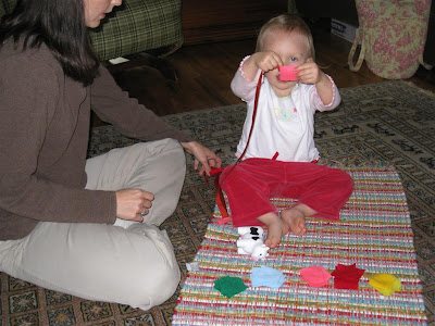My mom has a fun game where you match different colored bears to dots on a card. I thought O would love it since she loves to match, and she loves dots. She matched one or two bears before getting bored and moving onto the next thing. We'll try again tomorrow to see if she is more interested in the task.