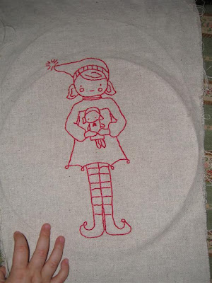 She's done! I've been working on this stitchette from Wee Wonderfuls for several days, and I was thrilled to finish her today. I'm making a Christmas stocking for O, and this was the first step. I know its not really the season for Christmas crafts, but I knew that if I waited it was unlikely I would finish it in time. Now the hard part...finding the perfect fabrics to finish the stocking! O really enjoyed watching me embroider. She said "uh-oh" each time I stuck the need through the fabric. This is the 1st time I've embroidered anything in almost 4 years, so I had my Klutz instruction book right beside me. O enjoyed looking at it while she sat beside me on the couch. It was a wonderful way to spend a quiet afternoon with my girl. I promised her that I will teach her to embroider in a few years, and she seemed pleased :) When I was trying to take this picture, O kept turning the fabric over. She was much more interested in the mess of fabric on the back than on the front. She also kept calling the girl "Marg," which was really sweet (Marg is her cousin and best friend).