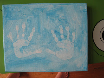After the canvas was covered with paint, she held her hands up and I pressed them onto the canvas. O was super excited when she saw her hands on the painting, and she wanted to make more. I told her that we'd make another one soon (because I want one for my wall!). The idea for this project came from here.