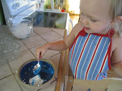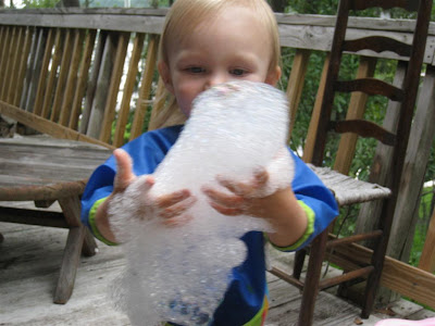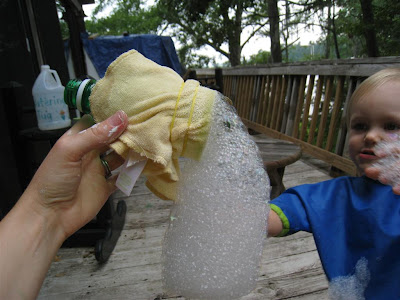 The idea and directions for this project came from this blog. All you need is a bottle with the end cut off, a washcloth, and a rubber band. Super simple and fun! Once you construct the foam maker, all you have to do is dip it in a flat dish of bubble solution and then blow. You'll have lots of fun foam! Unfortunately, this is not the greatest activity for a toddler. O helped make the foam maker by stretching the rubberband over the washcloth, but then it was time to make foam. Here's my advice to you...don't let your toddler blow on the bottle because if they suck back in, they will get a mouthful of soapy foam. Not fun! Poor little O. She was foaming at the mouth :( She handled it well, but she wasn't willing to try again.