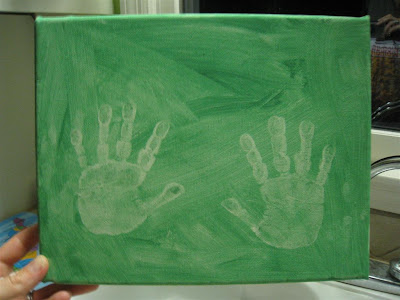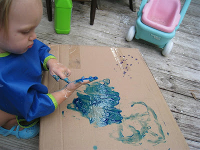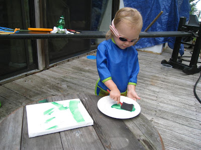 O had fun painting the canvas green. She said she was "done" before covering the canvas, so we painted the rest of it together. She liked me holding her hand and helping her finish which surprised me.