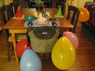 I taped balloons to all of our chairs. She is going to be SO EXCITED when she wakes up in the morning and sees everything. We have a busy day planned for O (storytime at the library, picnic with family and friends, and then swimming and playing in a small spray park), but I'll try to post pics tomorrow night :)