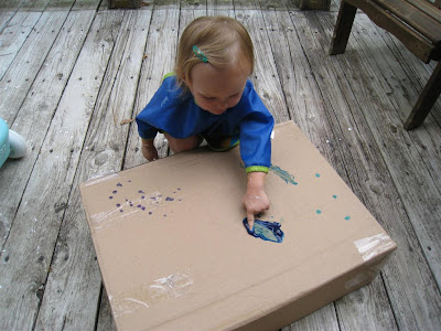 Leave the gift in the box it which it was shipped. Then put a few squirts of finger paint on it, and set your child loose! O had a great time painting Guh-guh's gift :) I planned on wrapping it in newspaper, and then painting it. Then I realized this would be much easier and faster (especially since I couldn't find any tape!). I think I know how we'll wrap all of our Christmas gifts this year! And the best part...its easy to recycle (I hate the waste of wrapping paper)..JPG)