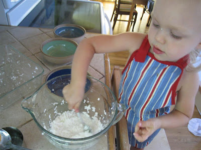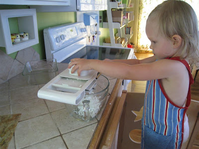 I thought it would be fun for O and I to make bathtub crayons a few days ago. I was right...it was fun, but the crayons were a dismal failure :( I can't find the recipe that I used, but its similar to this one. I think I should have grated my soap finer, and I added in extra water when the soap hardened too soon. Don't do that if you make these crayons! The crayons with the extra water were mushy and crumbly.