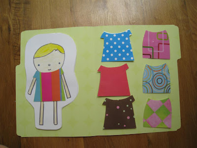 I cut dresses out of scrapbook paper, and then I laminated the dresses. I put a small sticky magnetic square on the back of the doll and on the back of each dress. Then I put magnetic squares in the file folder, so O would have a place to keep her doll and all of the dresses.