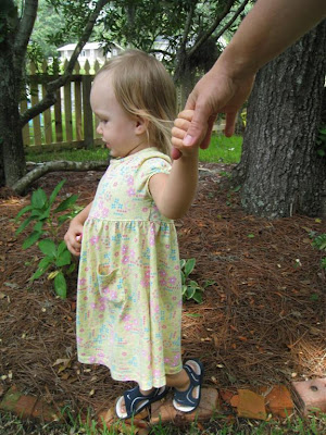 I've been planning on making O a balancing board out of leftover boards from her swingset for a while, but I just haven't gotten around to it. Today when we were going in from playing in her sandbox, she decided to balance on the bricks. What a great idea, O! I'm sure this will now be a daily activity!.JPG)