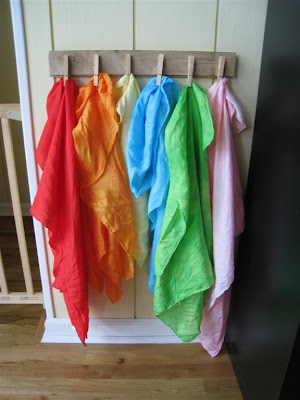 Since O hasn't been playing with her playsilks much lately, I decided that they needed to be more accessible. I *think* that the idea for this display comes from The Rowdy Pea, but I can't remember for certain. I used a leftover floorboard and hot glued clothes pins to it. Super simple and fast! O was thrilled, and she has been playing with her playsilks nonstop. She loves to wear them as skirts and hats :)