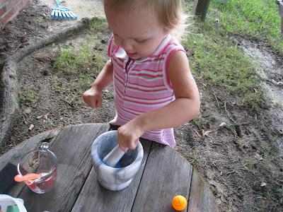 Since our last experience with our homemade chalk didn't work so well, we decided to try it again using a different (and simpler) method :) 1st we crushed O's wet chalk using the mortar and pestle. Then we added a bit of water and stirred.