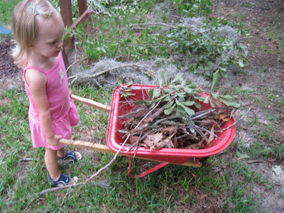 Don't be fooled by this photo! I filled the wagon with sticks, and O only pushed it for a few seconds. She had trouble balancing it. I think we need to practice when its empty a little more before I fill it again :) Her Guh-guh and Grandpa gave her this great wagon for her birthday, and she's excited to have an "agon just ike dada!" Hopefully, I'll get a little more work out of her tomorrow!