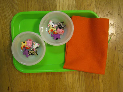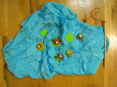 The idea for this game came from a commenter on the magnetic fishing game. I bought a packet of plastic frogs from the Dollar Tree and stuck tacks in their backs to make them magnetic. Then I borrowed the lily pad that O got from the lake today to use as a pattern, and I cut lily pads from craft foam. The blue playsilk makes the perfect pond, and we'll use the fishing pole from the fishing game. When we play this game, we'll work on one-to-one correspondence by trying to put a frog on each lily pad. We'll also talk about sizes since the lily pads are 3 different sizes, and we'll talk about colors since the frogs are several different colors. I think O will like this game because she LOVES lily pads. She has to get a lily pad to hold every time we go for a kayak or pedal boat ride, and she gets excited when lily pads wash up on the beach :)