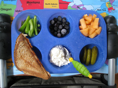 O was excited about Muffin Tin Monday today. She had bell pepper strips, frozen blueberries, cantalope, pizza pocket (made in our sandwich maker with whole wheat bread with spaghetti sauce in the middle), cottage cheese, and mini dill pickles. She LOVED the pickles and was disappointed that these were the last 3.