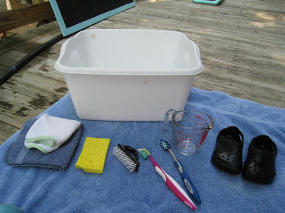 The idea for this activity came from the Montessori n Such catalog (I LOVE that catalog!). You need a container, wash cloths (the small one is for washing and the larger one is for drying), a couple of brushes, a sponge, and shoes.
