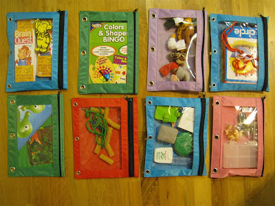 Ok, I have to admit that I CAN'T STAND ziploc bags. They just seem very wasteful and flimsy to me. However, I couldn't think of anything else to use when I made O's toddler activity bags. Then, about a month ago, I saw these pencil pouches. I knew they would be perfect for most (but not all) of the bags. They are much more durable, and they look so much better than the ziploc bags. I am VERY happy with them. These bags will also provide O with lots of opportunities to practice her zipping and unzipping skills. Also, since they have metal grommets, I can hang them from hooks or group them together with book rings when we travel.