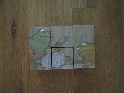 To make these block puzzles you need 6 unfinished wooden blocks, mod podge, and storybooks that you don't mind cutting. I made a similar puzzle using pictures from O's 1s birthday party about a year ago, and I planned on using photos to make another one. Then I decided to do something a little different, and I hope she'll really like it :) We have several old children's books that have torn pages that I've been saving for a project, and I bought several elementary literature textbooks (25 cents each) for various projects. I decided they would be perfect for this! The books featured on the blocks are Frog and Toad (one of my childhood favorites), Little Bear (another favorite of mine), Goodnight Moon (O's favorite), Madeline, The 3 Little Bears, and Curious George. These blocks will be a Christmas gift for O, and I'll probably give them to her as an advent gift. I'm planning on putting clues in our advent calender and have her search (with my help of course!) for her gifts which will be hidden in the house. Hopefully, most of the advent gifts will be homemade!