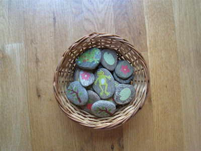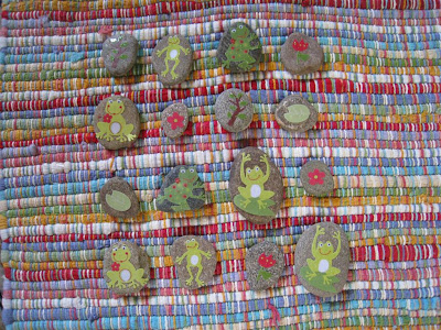 When Amber commented on the Shell Matching game that she may make a similar game with rocks, I knew I'd have to try it! Thanks, Amber! I have lots of river rocks from our recent mountain vacation, and I knew they'd be perfect :) I planned on finding insect stickers, but I never found any, and I loved these frog stickers the 1st time I saw them (although I didn't buy them until the 3rd time because I was being indecisive!).