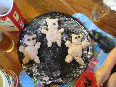 O was thrilled to make 3 little bears of bread...mama, dada, and O, of course! She had fun rolling the dough and decorating the bears with raisins.