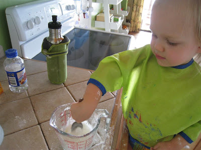 To make the watercolors you need 3 Tbs cornstarch, 1.5 tsp corn syrup, 3 Tbs baking soda, 3 Tbs white vinegar, food coloring, and small containers. When you mix the 1st 4 ingredients, you'll see (and hear) lots of fizzy fun! This was O's favorite part of the activity. She was VERY impressed with the fizzing! We then poured the mixture into several small containers and added food coloring. This was yet another lesson in color mixing since we made orange and purple. She wanted to mix yellow and blue to make green, but since we already had green (and we didn't have enough mix to make 2 greens) we didn't make another.
