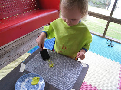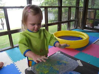 This activity has been on my to do list for a LONG time (at least 3 months!), and I don't know why its taken so long to get to it! You need bubble wrap, paint, and paper. I taped the bubble wrap onto a table, and O painted it. She was a little tentative at first, and she asked for paper. I assured her that it was ok to paint the bubble wrap, so she jumped right in :)