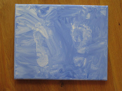 She loved mixing the color on her hands and then smearing it onto the canvas. She was very excited that we were going to be making footprints instead of handprints. Although she did make a few handprints while she was covering the canvas with paint.